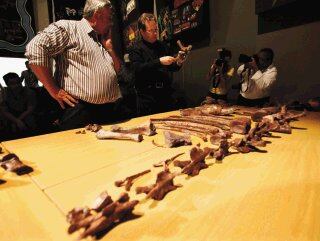 Los fósiles, exhibidos en una mesa, fueron hallados en el poblado de Senekal, cerca de Bethlehem, en el estado sudafricano de Fezile Dabi.