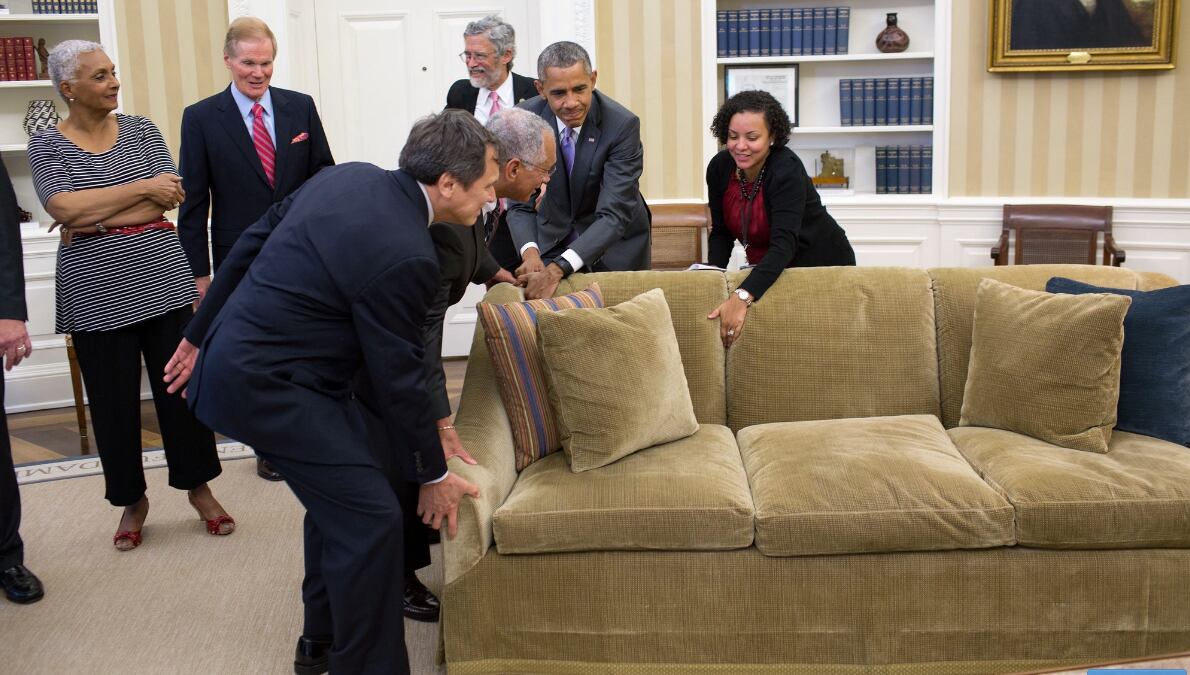 "En esta foto estamos moviendo uno de los sillones que nos estorbaba para la foto que el Presidente quería tomar. A mi lado están el administrador (director) de la NASA, Charlie Bolden, amigo y compañero de vuelo, el presidente Obama y una de sus asistentes. Entre los cuatro movimos el sofá, que estaba bien pesado", comentó Chang.