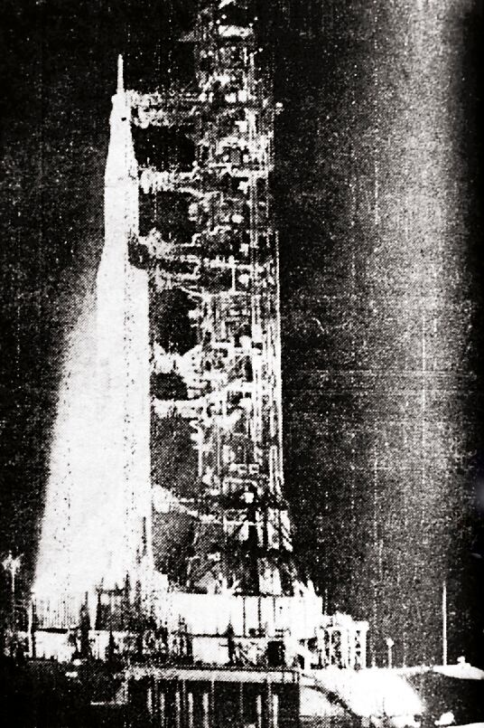 En la rampa de lanzamiento los técnicos de tierra instalaron las baterías de vuelo en el Saturno cuya altura es similar a la de un edificio de 36 pisos, mientras la cuenta regresiva entraba en su fase final una crítica etapa en la que el vehículo impulsor debe quedar afrontado para el despegue se efecturá a las 9:53 p. m. (0253 GMT) de mañana.