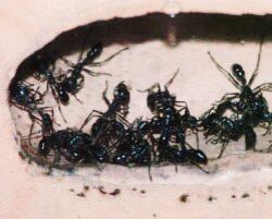 El hormiguero de las balas en el INBioparque tiene unos 450 individuos. Casi todas esas hormigas son hembras obreras o soldados. Solo existe una reina, la cual pone los huevos para mantener la población constante.