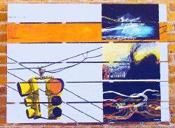 Cada pieza de Paisaje urbano es un collage de imágenes y detalles de la ciudad: semáforos, cables, marcos de puertas, señales de tránsito, postes y luces en movimiento.