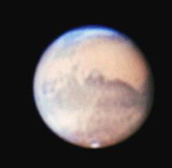 A simple vista. La mayoría de los telescopios hogareños podrán captar a Marte como una pelota pequeña y brillante. Observadores con instrumentos más poderosos podrán discernir detalles sobre la superficie del planeta rojo, incluyendo su capa de hielo en el sur y sus nubes blancas.