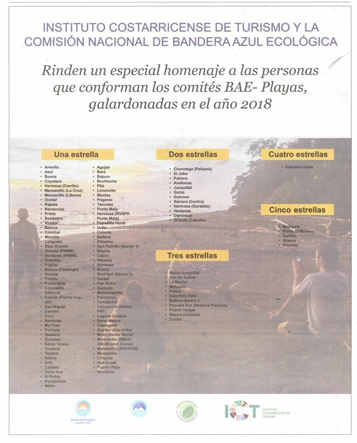 Las playas anunciadas corresponden al resultado de la evaluación del período 2018. Entre ellas, cinco consiguieron el puntaje para ganar el máximo de cinco estrellas. Ellas son: playa Matapalo y Punta el Madero en Guanacaste norte, playa Carrillo en Guanacaste sur, playa Blanca y Playitas en el Pacífico central.