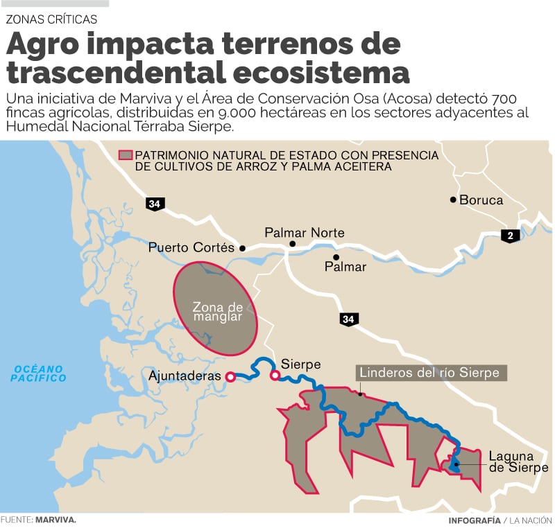 Por su parte, Carlos Martín Zamora, director ejecutivo de la Cámara Nacional de Productores de Palma (Canapalma), dijo que, por el momento, no saben cuántos de los productores asociados a su representada cuentan con fincas agrícolas dentro del humedal Térraba Sierpe o en sectores aledaños a este.