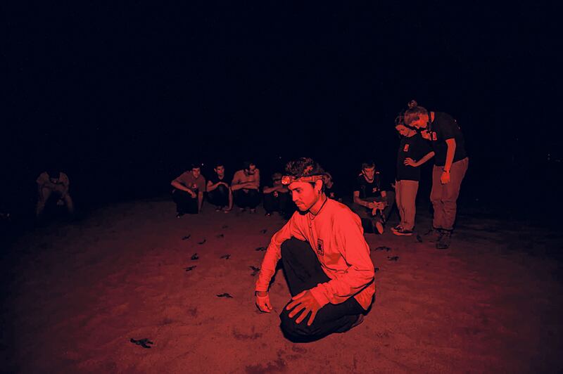 A veces se encuentra con otros asistentes de investigación o con los voluntarios que ayudan en el trabajo de playa, pero la mayor parte del tiempo su compañía es la luz roja que coloca en su cabeza, la única que no molesta a las tortugas durante el desove.