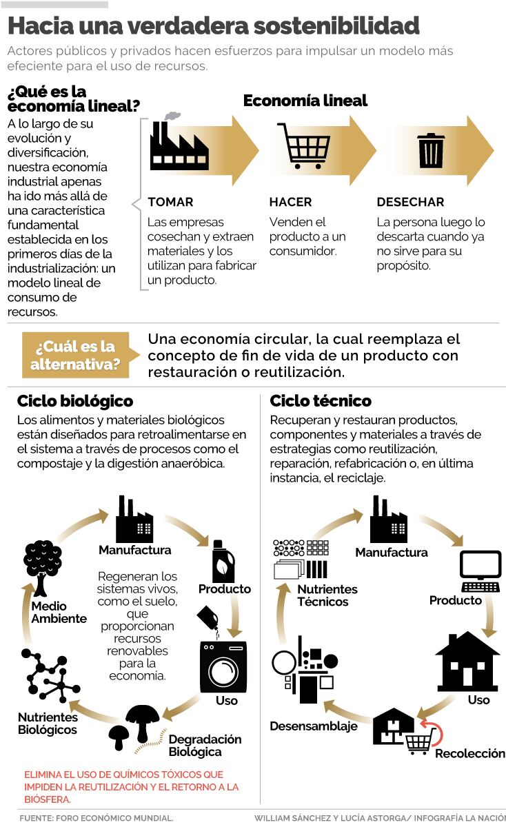Según el Foro Económico Mundial (WEF, por sus siglas en inglés), este sistema está fundamentado en la manufacturación de bienes a partir de materias primas, que son vendidas y usadas, para luego ser descartadas o incineradas como desechos, en un ciclo finito.