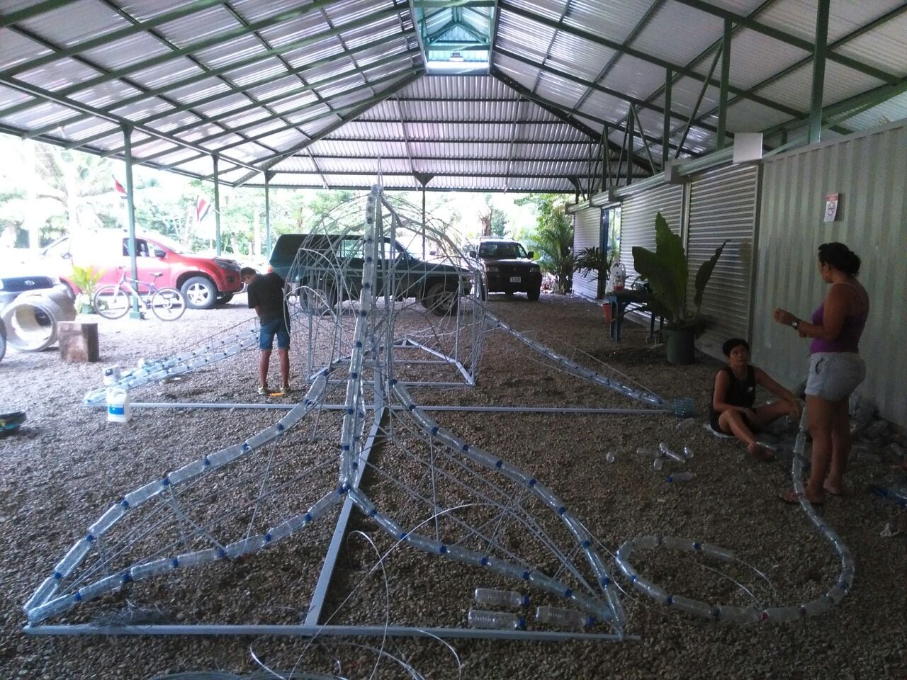 Para concientizar al respecto, y con la complicidad y guía de Albán Corrales, quien es artista del grupo Trincheras de San Isidro de Pérez Zeledón, toda la comunidad se dio a la tarea de construir esta enorme ballena con 3.494 botellas plásticas. Los envases provienen de lo recolectado durante los tours realizados en el 2014 y el 2015.