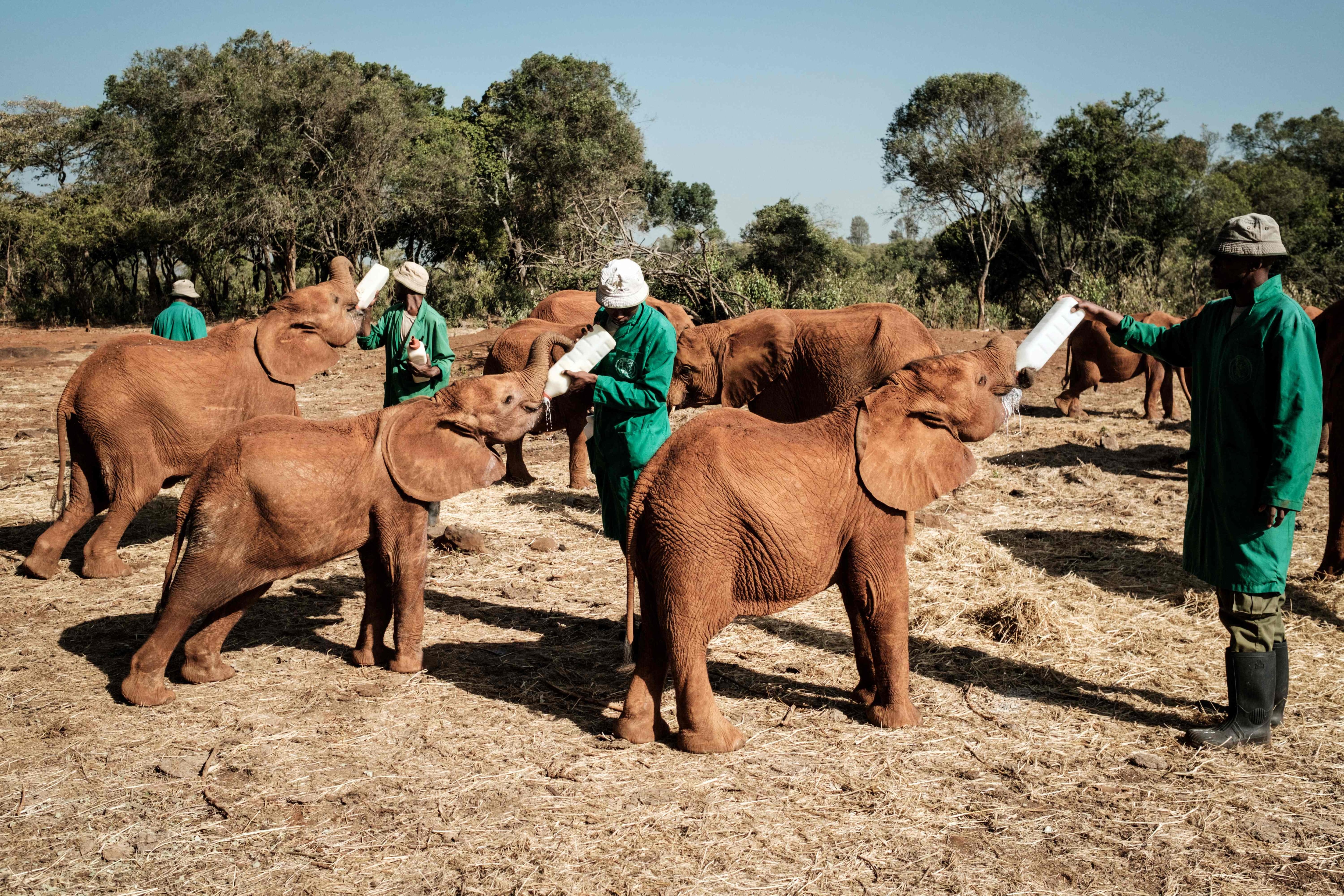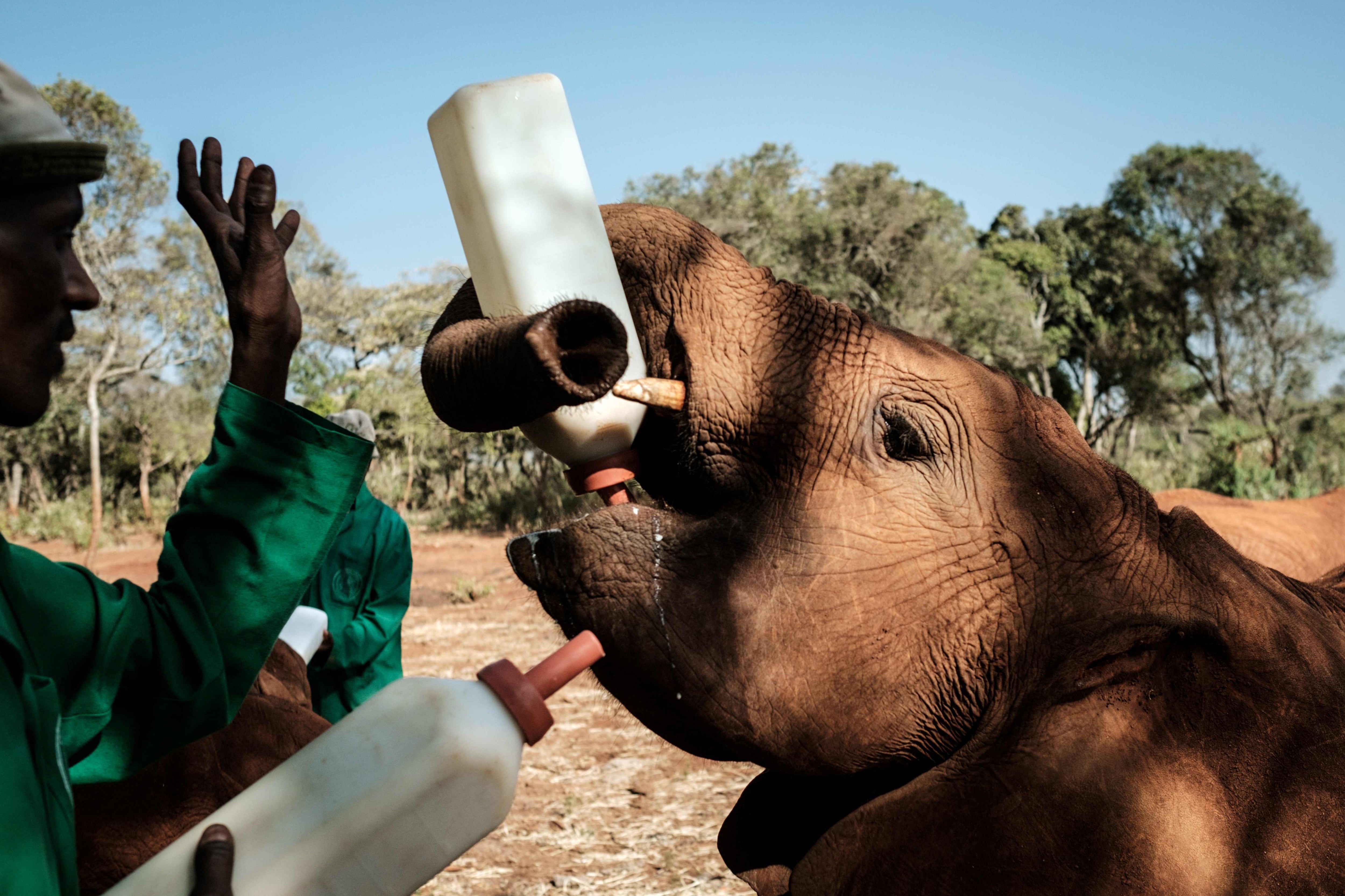 Los pequeños elefantes se abalanzan cada día a unos biberones gigantes con una mezcla de leche en polvo para humanos, agua y vitaminas, una receta desarrollada por el centro para sustituir la leche materna.
