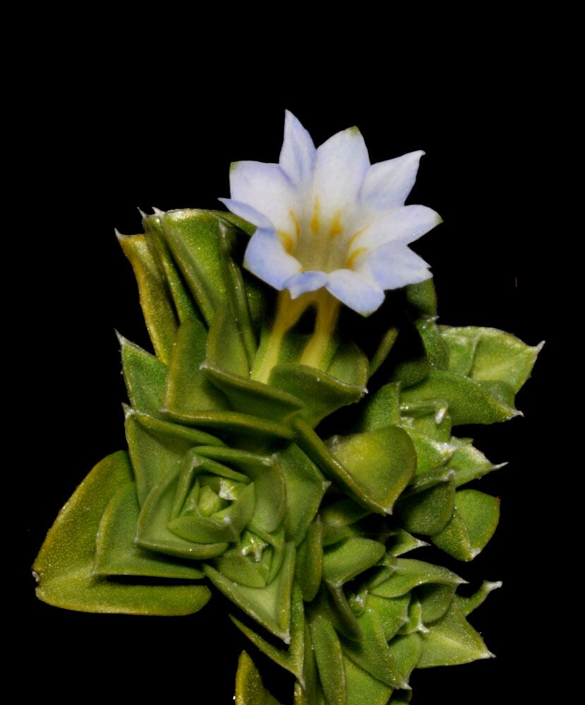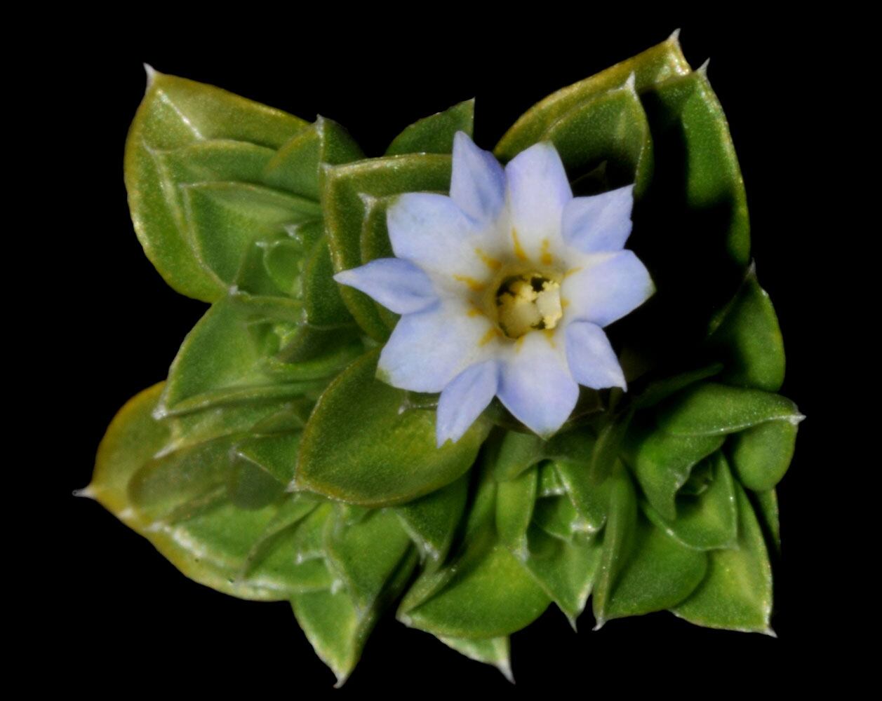 Esta diminuta planta es muy compacta, con hojas en forma de espátulas, densamente superpuestas a lo largo de los tallos durante la época de floración. También se distingue por sus flores blanco-azuladas en el exterior y amarillo-rayadas en el interior de la flor.