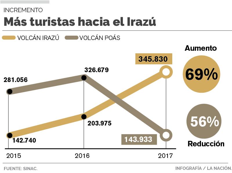 El más afectado de la ecuación, el Poás, reportó un descenso de 326.679 personas en el 2016, a 143.933 el año siguiente, para una caída del 56%.