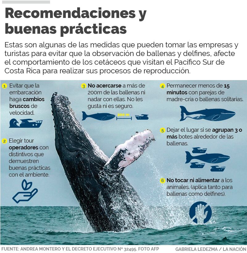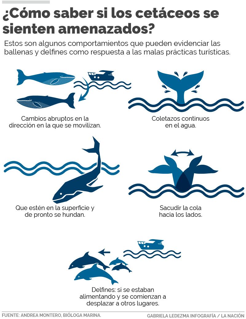 “Es más peligroso que una ballena vuelque una embarcación por no tomar medidas de seguridad, como mantener una distancia mínima. Obviamente que muchos de los operarios se acercan más de la cuenta para recibir más propina, para que la gente pueda tomar mejores fotos”, expresó Juan Diego Pachecho, director ejecutivo del Centro de Investigación de Cetáceos de Costa Rica.