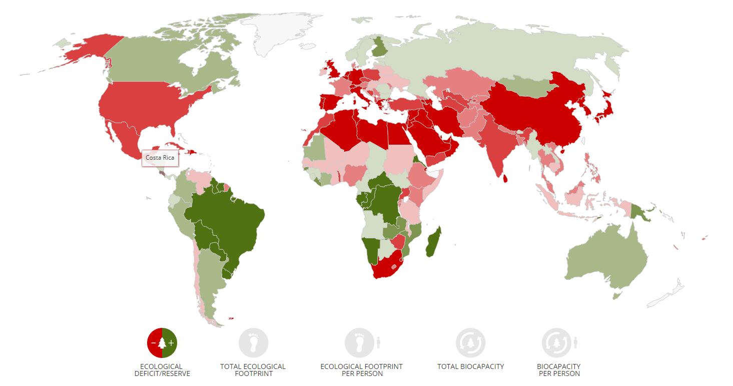 Por ejemplo, Costa Rica cuenta con un déficit de -0,9 hectáreas globales, ya que su demanda de recursos para el consumo por persona es de 2,5 gha, superando así la capacidad regenerativa de sus ecosistemas, la cual se estima en 1,6 gha por persona.