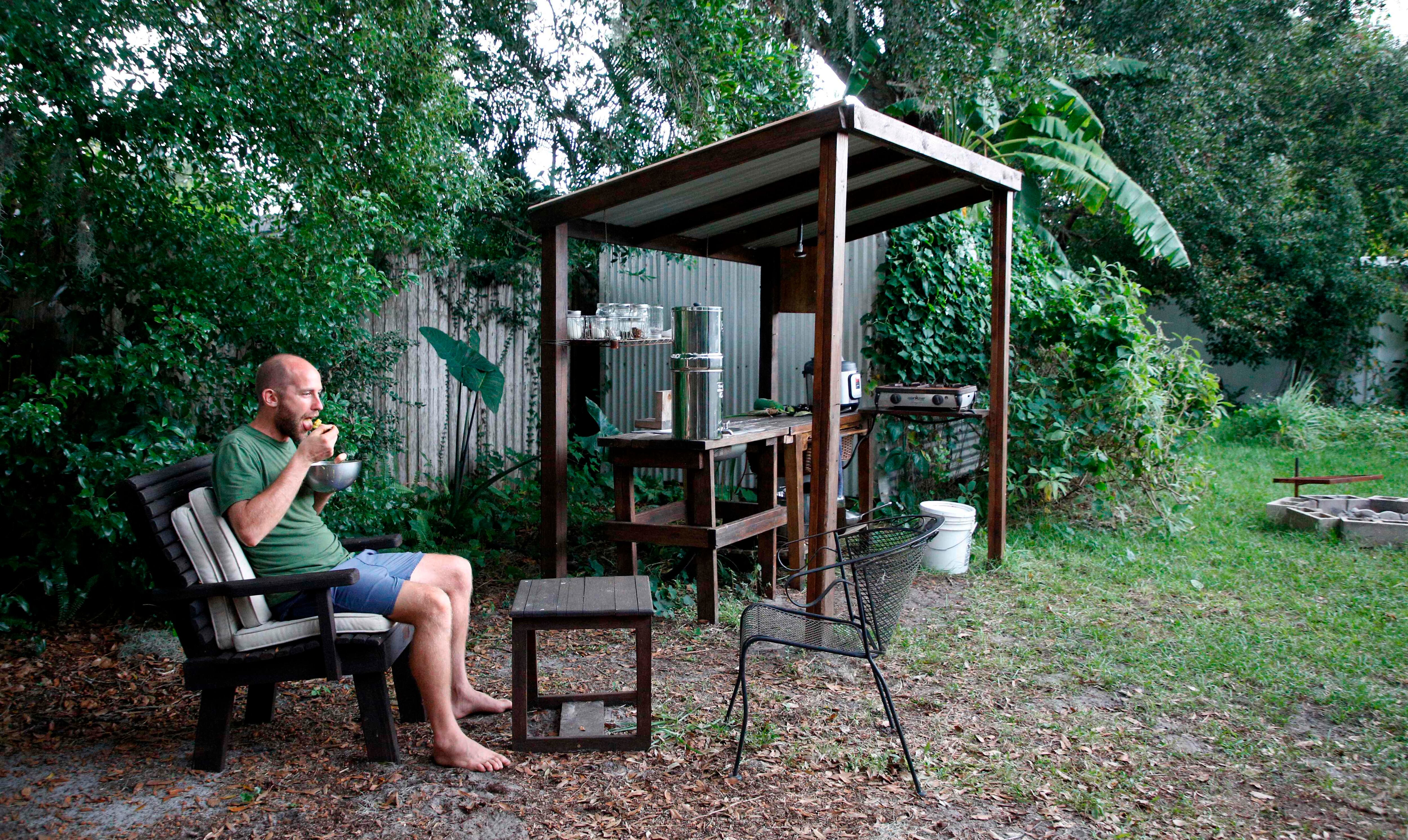 Por un año, ha vivido en el patio trasero de una casa cuyos dueños le permitieron usar el terreno para su proyecto. El jardín, antes un césped bien cortado como el de los vecinos, es ahora una pequeña selva donde crecen frondosamente papayas, yucas, bananas, papa dulce, pimientos, berenjenas, tomates y granadas, entre otros.