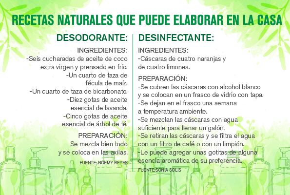 Los productos de limpieza de la casa, que son los que se emplean más seguido. Estos se hacen de agua oxigenada, infusiones de canela o de cáscaras de limón y aceites aromáticos. Si se quiere una desinfección mayor, Sonia recurre al alcohol.