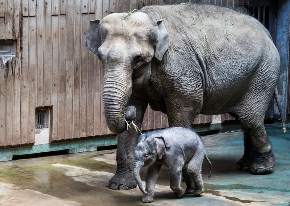 Pegado a su mamá, un elefante asiático recién nacido enfrentó al público por primera vez.