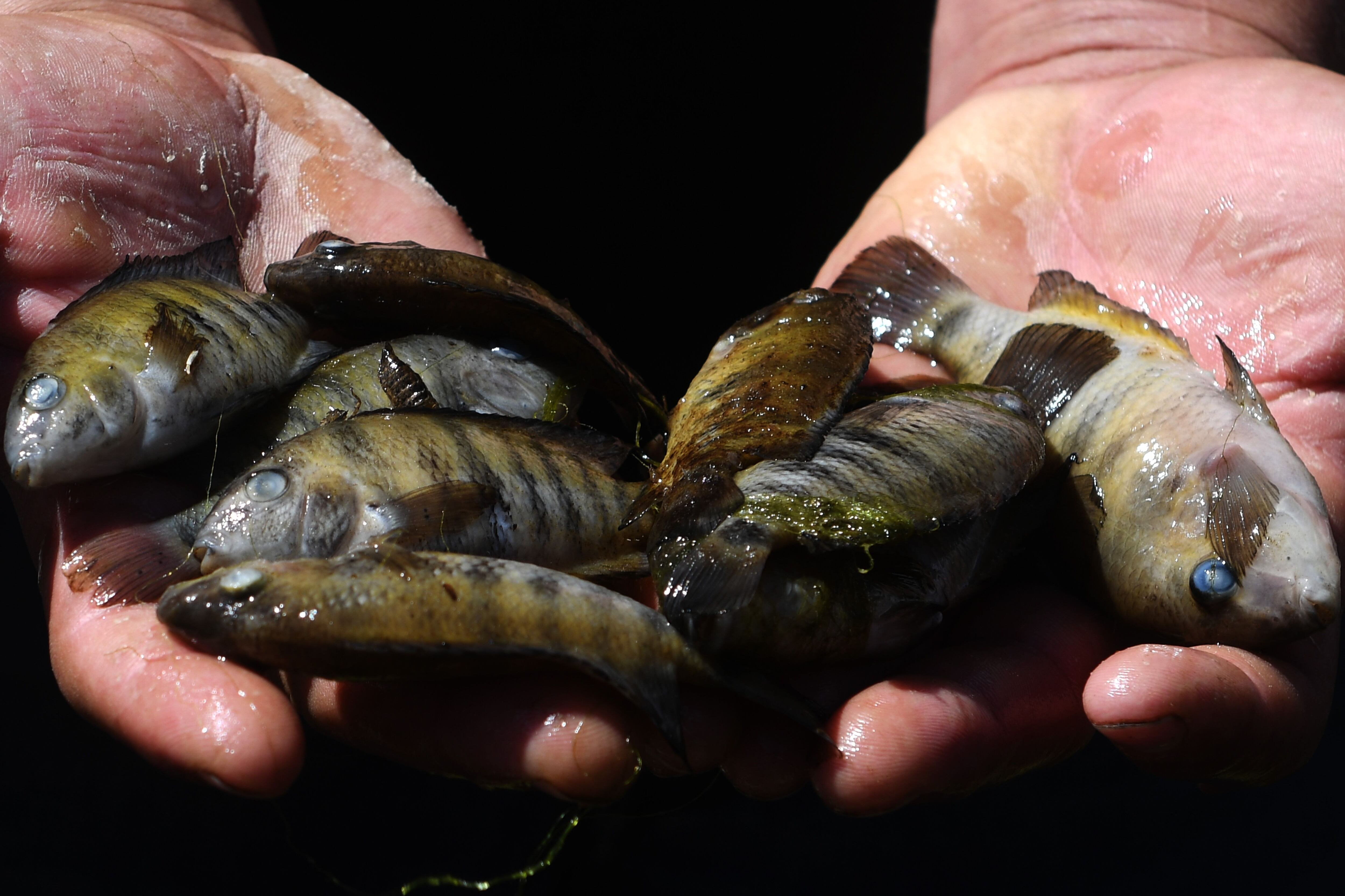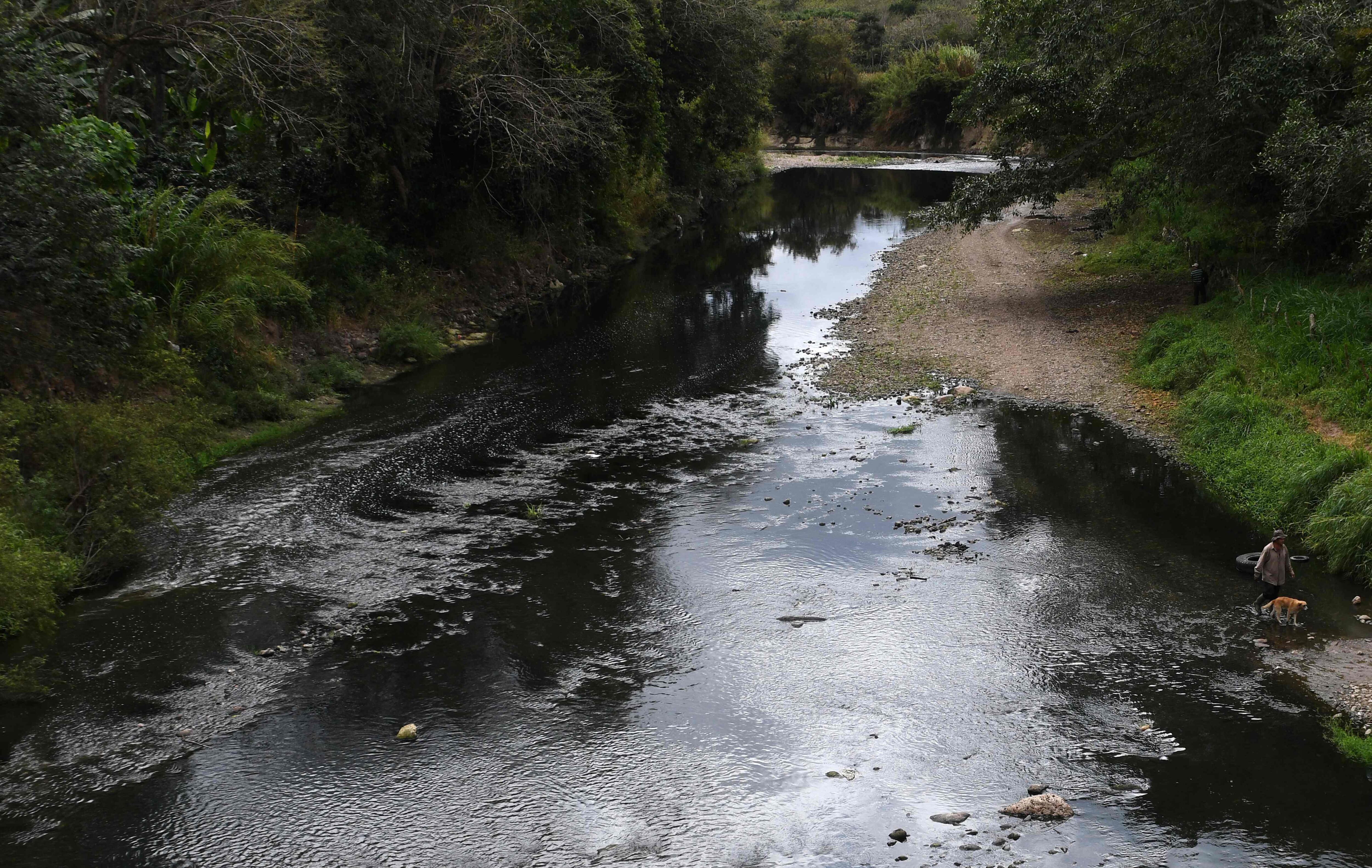 Desde lo alto de un viejo puente colgante de madera en reparación, los habitantes de Piñuelas observan con tristeza cómo flotan los peces sin vida y las corrientes arremolinadas los arrastran aguas abajo, aunque muchos son impulsados por el viento a la orilla, donde quedan atrapados entre piedras.
