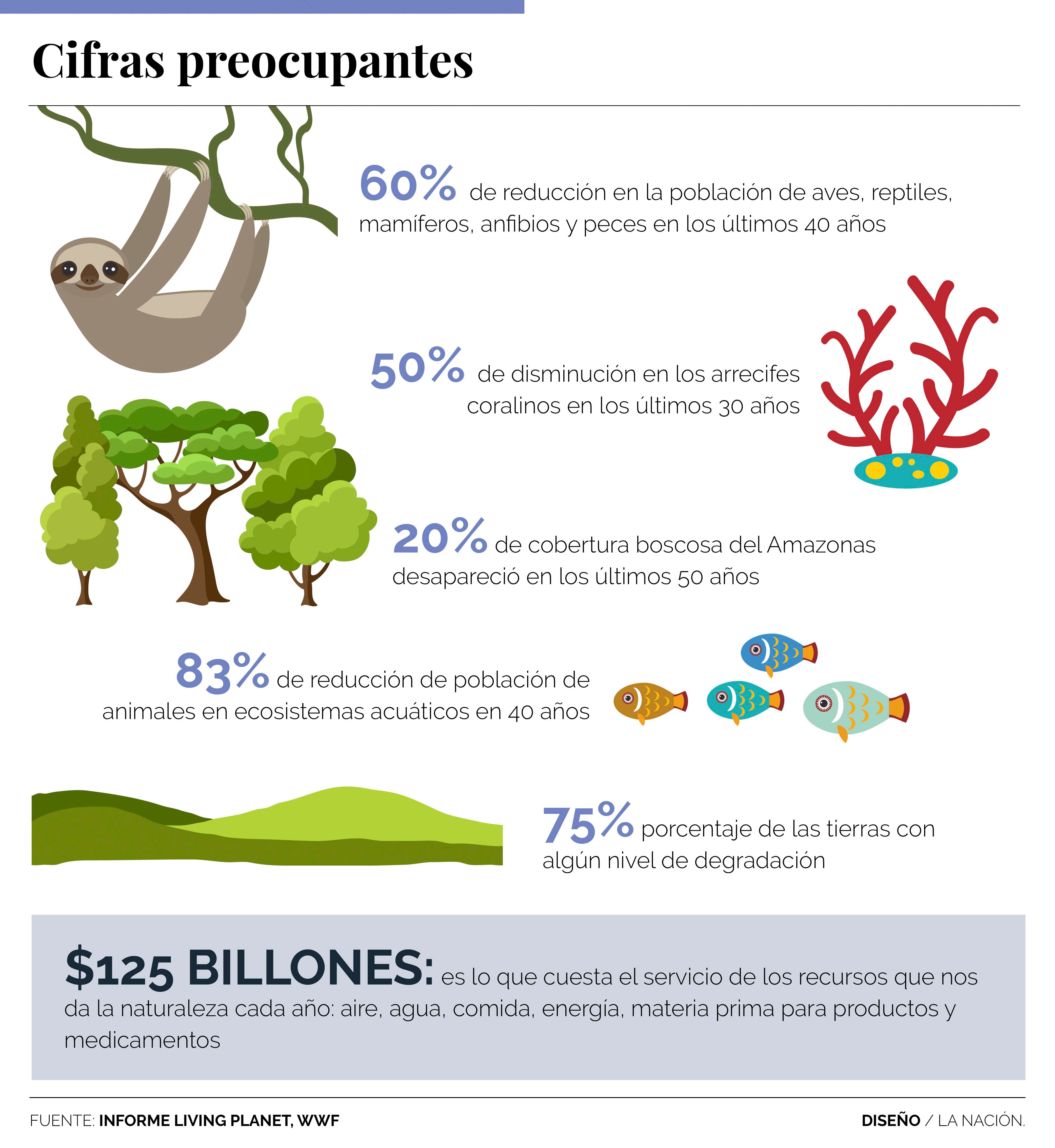 En los últimos 40 años, la población de mamíferos, reptiles, anfibios, aves y peces se redujo en un 60%. Aún más: la población de arrecifes coralinos se disminuyó a la mitad en tres décadas y el 20% de la cobertura boscosa del Amazonas desapareció en el último medio siglo.