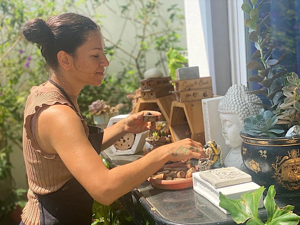 “Yo trabajé por años en publicidad pero mi terapia siempre ha sido el jardín, andar descalza y sin guantes en contacto directo. De hecho, observar las abejas nunca fue lo principal pero hace como siete años vino una abeja de color verde muy brillante que siempre volaba al frente de mi cara. Como que me quería decir algo y fue poco después que descubrí la meliponicultura”, recordó.
