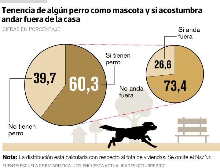 En ese sentido, encontraron que el 60,2% de las viviendas del país tienen canes como mascotas y en un 26,6% de estas, el perro acostumbra andar fuera de la casa, solo, sin ninguna compañía.