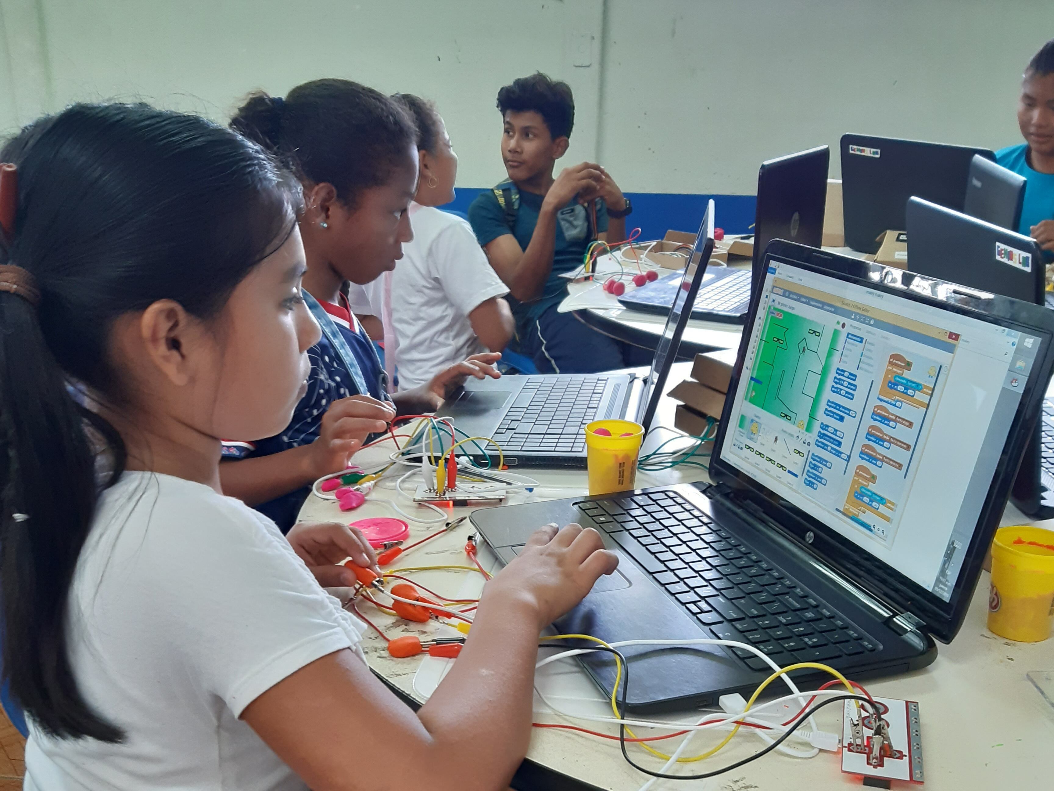 Niñas de la comunidad indígena de Amubri, en Talamanca, dejaron por unos días sus ocupaciones tradicionales para aprender sobre circuitos, robótica, y cómo la tecnología podría ser una herramienta útil para mitigar los efectos del cambio climático.