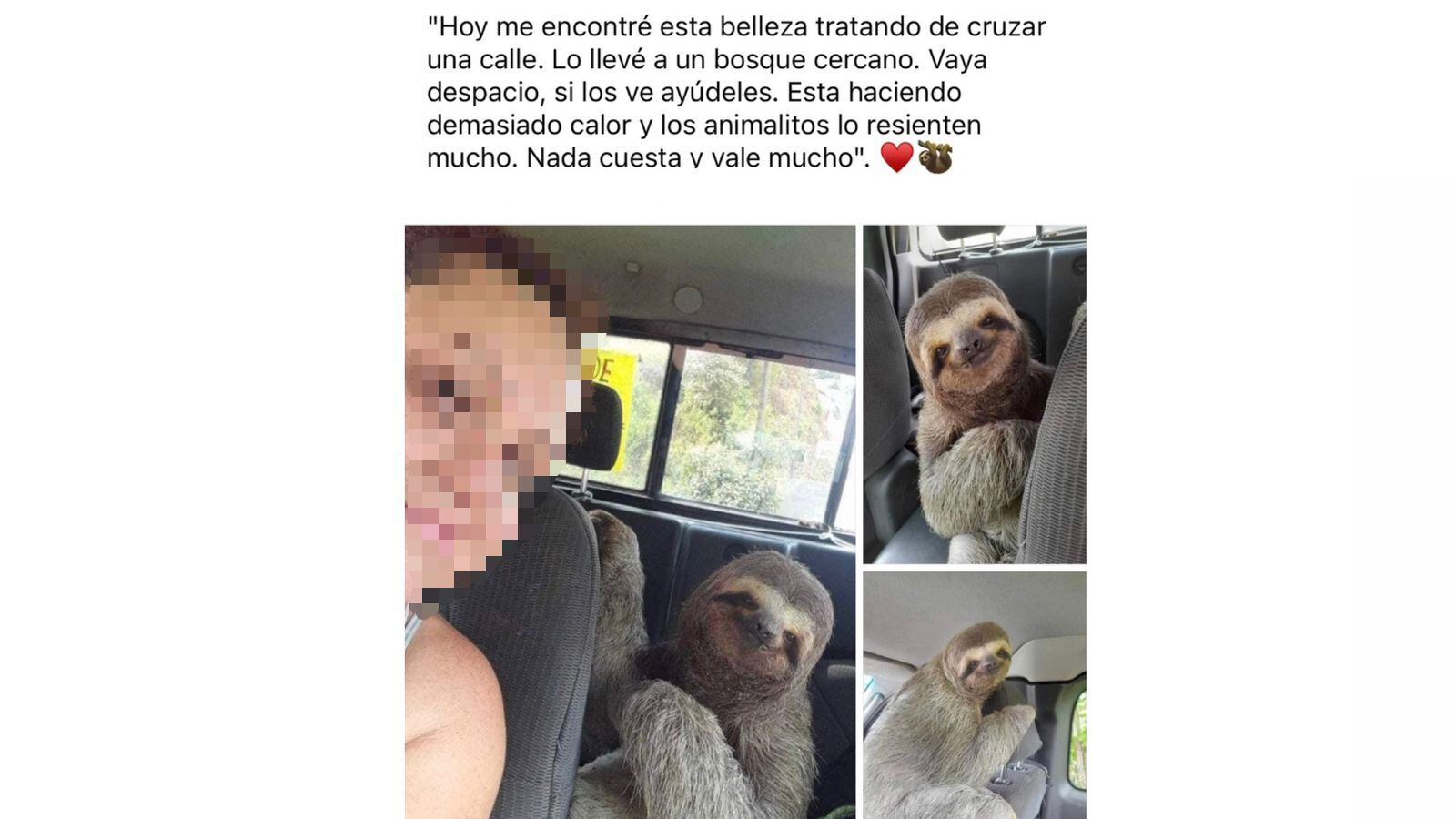 Las fotografías de una mujer con un perezoso en su vehículo se compartieron de manera viral en redes sociales. La conductora dijo que se encontró al animal en medio de la carretera, por lo que decidió ayudarlo a llegar a un bosque cercano.