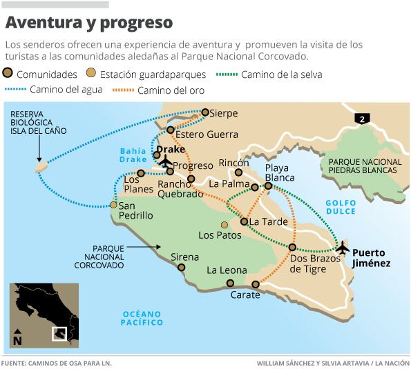 ¿Por qué las rutas son alrededor del Parque Nacional Corcovado? Para que, además de la visita a esta área protegida, los turistas tengan que pasar, obligatoriamente, por las comunidades aledañas. Ahí los lugareños los esperan para atenderlos con emprendimientos, como pequeños complejos de cabinas y sodas.