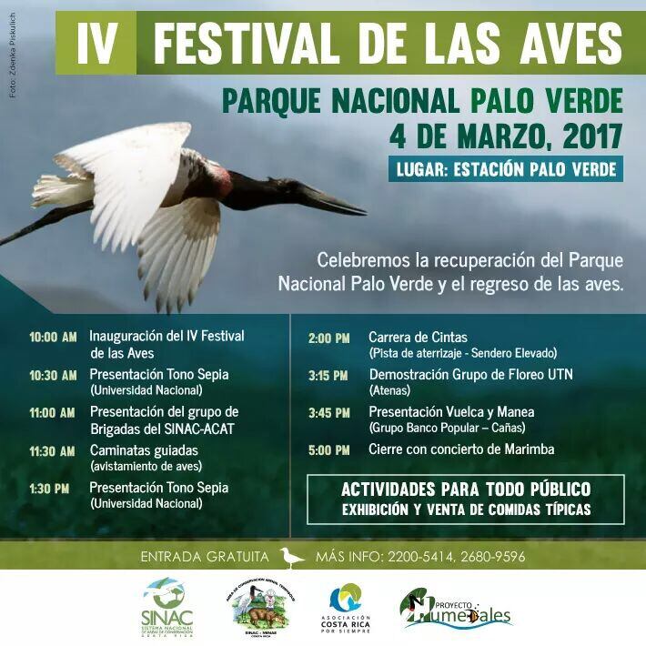 El tercer festival también está dedicado a las aves, solo que esta vez a aquellas que llegan a la cuenca baja del Tempisque en Guanacaste. El Parque Nacional Palo Verde será la sede del IV Festival de las Aves, cuyas actividades darán inicio a las 10 a.m. e incluyen caminatas guiadas para observación de pájaros.