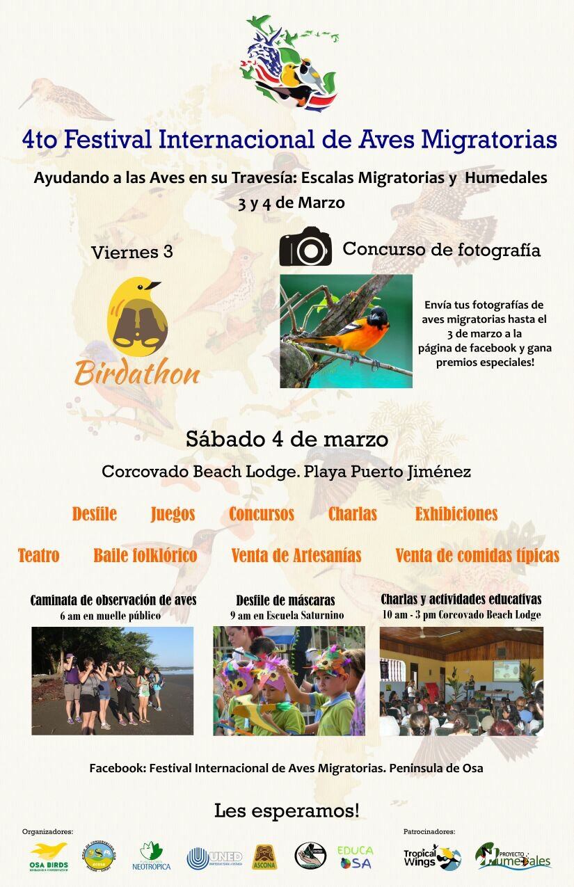 El segundo festival en agenda para este sábado será en península de Osa, específicamente en la playa de Puerto Jiménez. El IV Festival Internacional de Aves Migratorias tendrá desfiles, juegos, concursos, charlas, exhibiciones, obras de teatro, comidas, música y venta de artesanías.