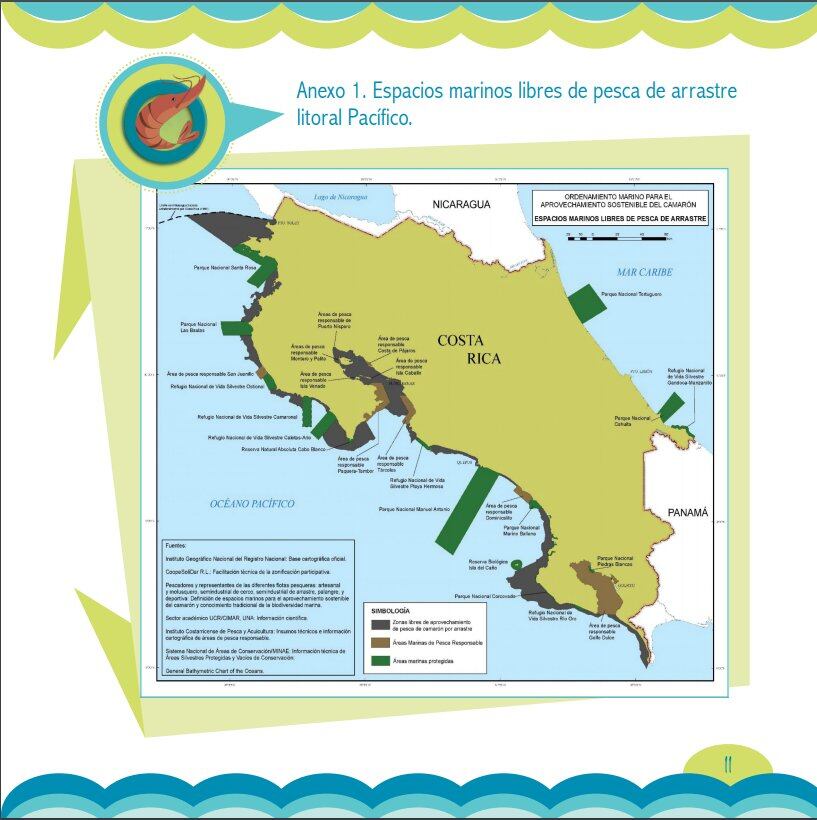 El material utilizado es una serie de mapas de zonificación elaborados por ambas universidades, los cuales determinan cuáles son las áreas marinas de conservación, es decir, las zonas que quedan excluidas de la pesca de camarón, ya sea porque son parques nacionales o porque son sitios vulnerables.