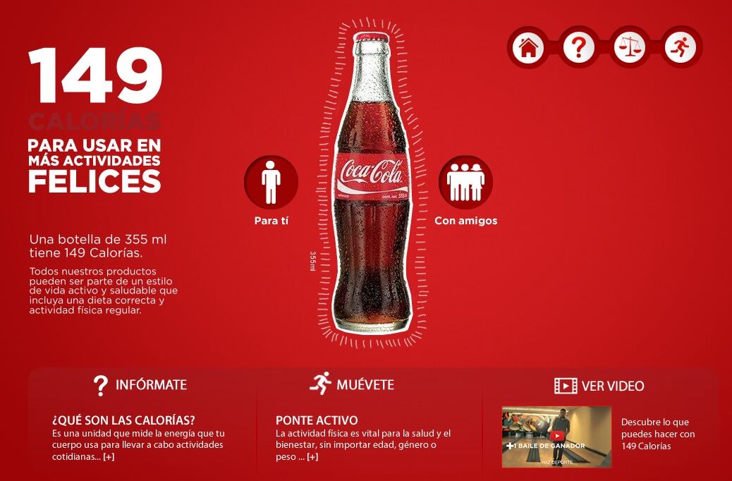 Agrega que, "la campaña comunicaba de manera clara y veraz la cantidad de calorías que tiene una Coca-Cola de 355 ml, que son 149, en tanto animaba a la gente a usar las calorías que consumen en actividades que les hagan felices, a través de hábitos cotidianos, como reír, bailar, saltar, o sacar a pasear al perro, entre otros, y así lograr lo que los expertos llaman balance energético", dice el comunicado.