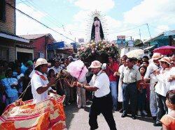 A las 12 m., bajo el sonido de bombas y campanas, un grupo de devotos transportó la imagen desde la Virgen de la iglesia colonial, hasta la antigua cofradía.