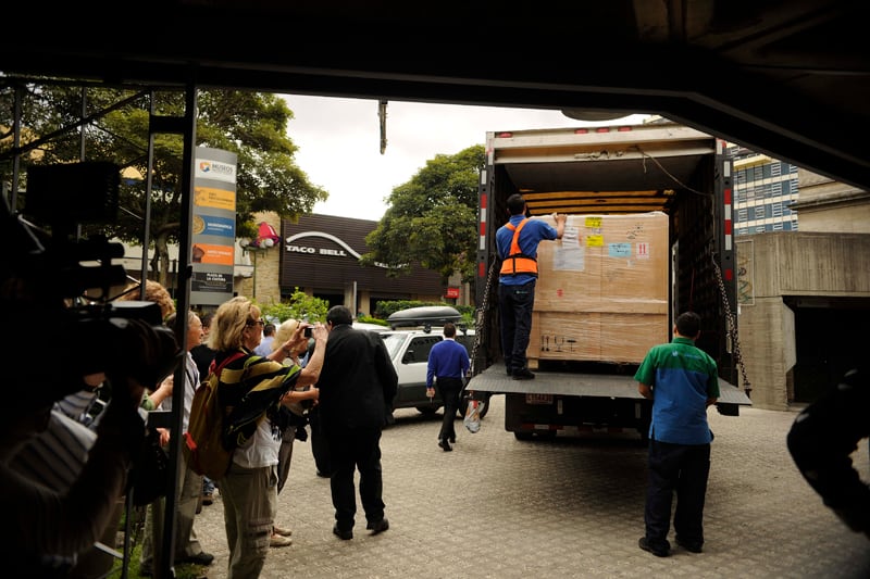 Tras remover varias láminas de plástico de burbujas y bloques de estereofón , los paquetes debidamente embalados fueron colocados en un carro pequeño para ser transportados, en ascensor, hasta el sitio donde serían desempacadas las obras.