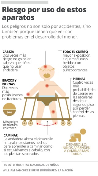 De acuerdo con la directora del Hospital Nacional de Niños, Olga Arguedas, un estudio hecho por profesionales de ese centro de salud reveló que entre el 2010 y el 2016 se atendieron 434 niños por accidentes relacionados con el uso de andaderas.