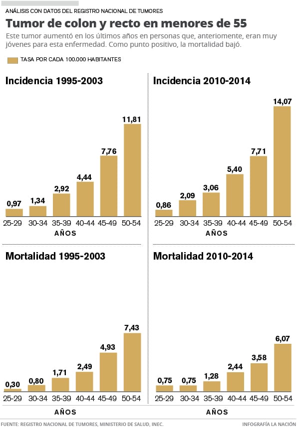 Las estadísticas del RNT indican que, entre 1995 y 2003 la incidencia (número de casos nuevos por año) de cáncer colorrectal en este rango de edad fue de 17,43 casos por cada 100.000 costarricenses, mientras que entre 2010 y 2014, subió a 19,12 por cada 100.000 habitantes.