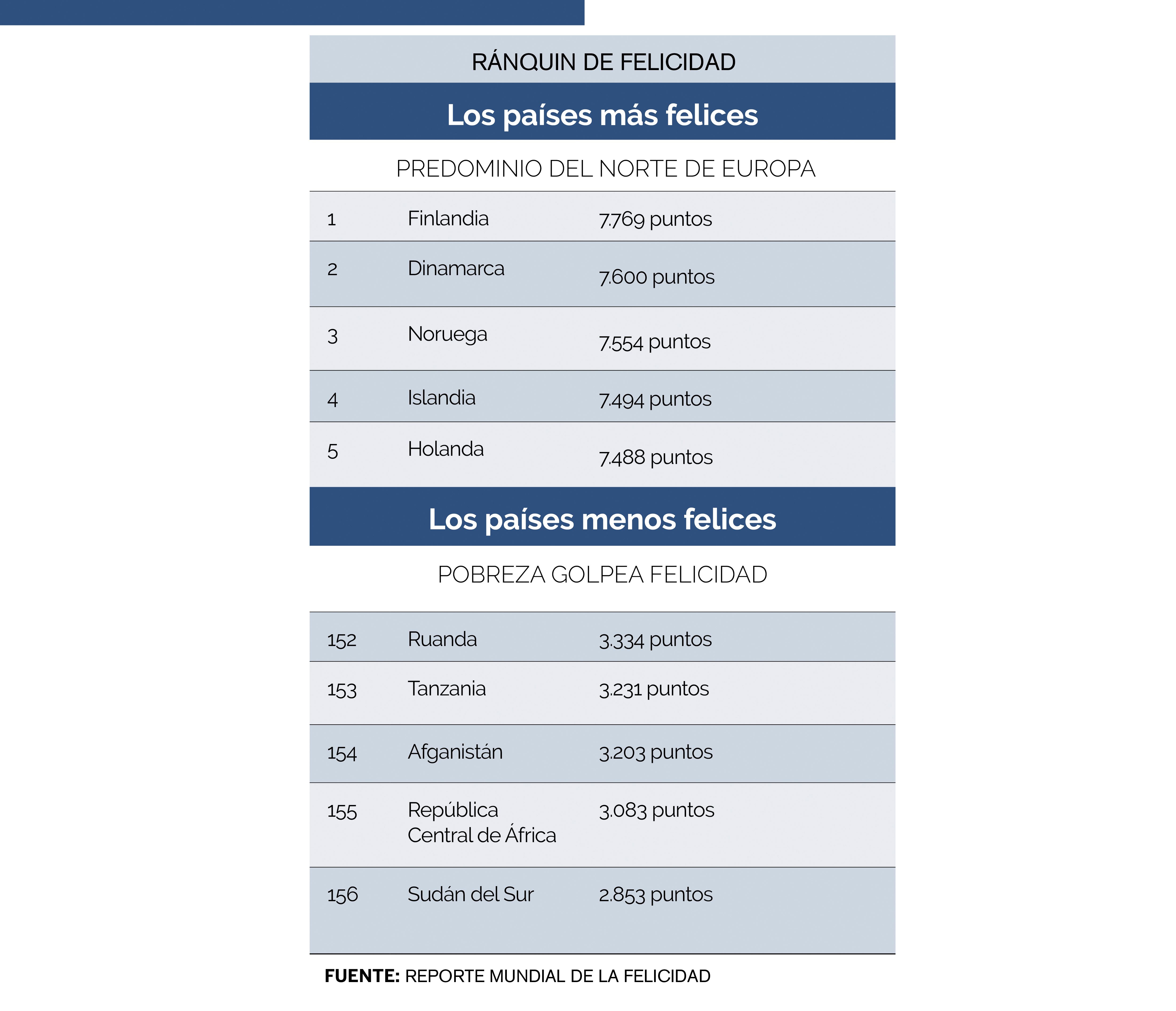 Por su parte, los tres países con menos felicidad son Afganistán (3.203 puntos), República Central de África (3.083) y Sudán del Sur (2.853).