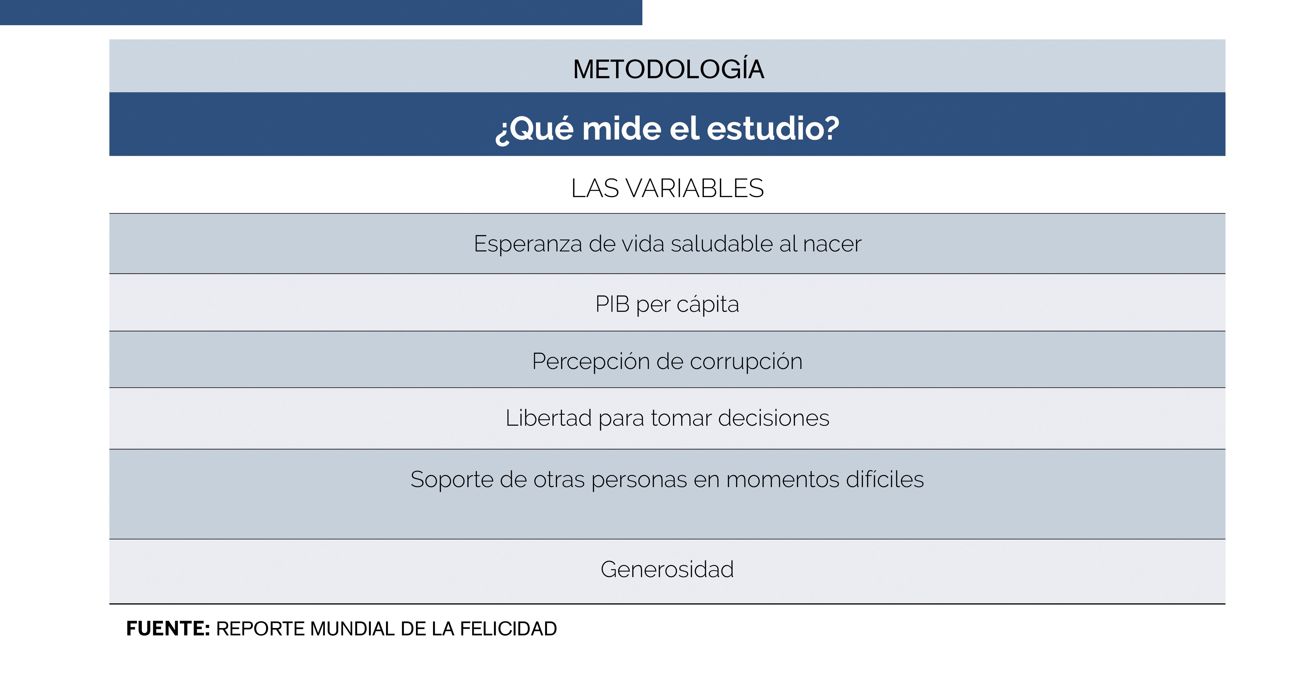 Además, en el análisis entra en juego una encuesta sobre felicidad realizada por la firma Gallup en todos los países. De esta herramienta se analizan algunas variables: soporte social (tener a personas que apoyen en momentos difíciles), libertad para tomar decisiones, percepción de corrupción en el país y generosidad (participar de actos de caridad).