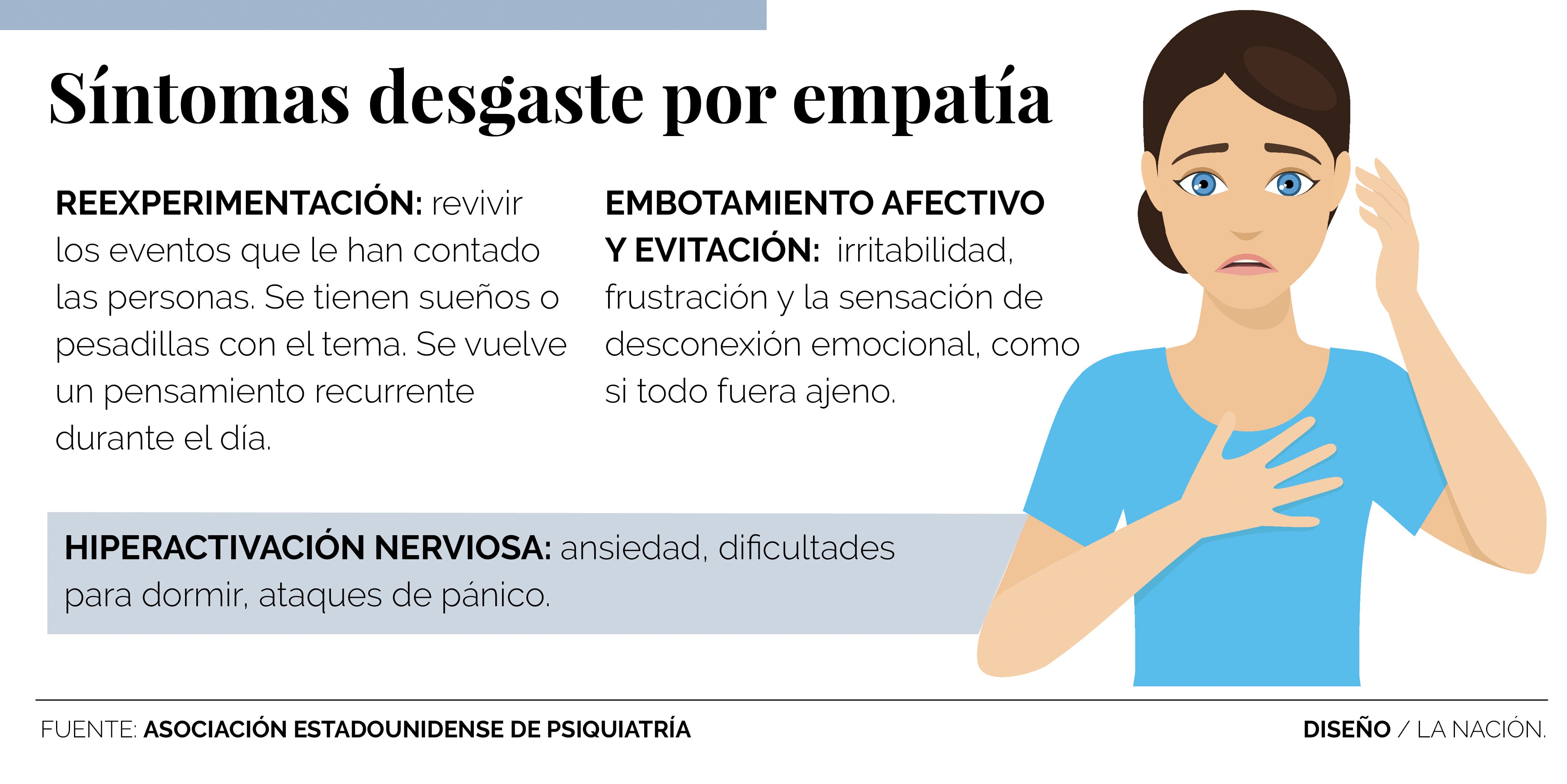 Hay tres síntomas del desgaste por empatía que pueden reconocerse para tomar acciones a tiempo. El primero es la reexperimentación. Se reviven los eventos de lo que le han contado las personas, se recuerda cómo se pusieron a llorar, los detalles de las historias que contaron. Se tienen sueños o pesadillas con el tema. Los hechos se vuelve un pensamiento recurrente durante el día.
