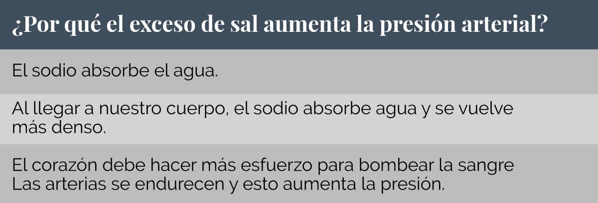 Abusar de la sal y de alimentos con sodio hace que el cuerpo ingiera exceso de este mineral, y esto retiene agua en el cuerpo, genera presión en las paredes de los vasos sanguíneos y en los riñones.