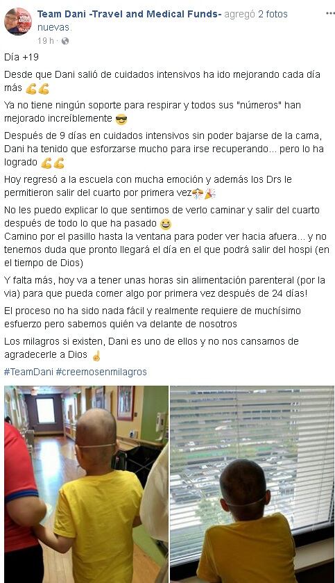 La salud de Daniel León mejora luego de que estuviera unos días en cuidados intensivos por una recaída. El perfil Team Dani –Travel and Medical Funds– indicó este martes que el menor ya no tiene ningún soporte para respirar y todos sus "números" han mejorado increíblemente.