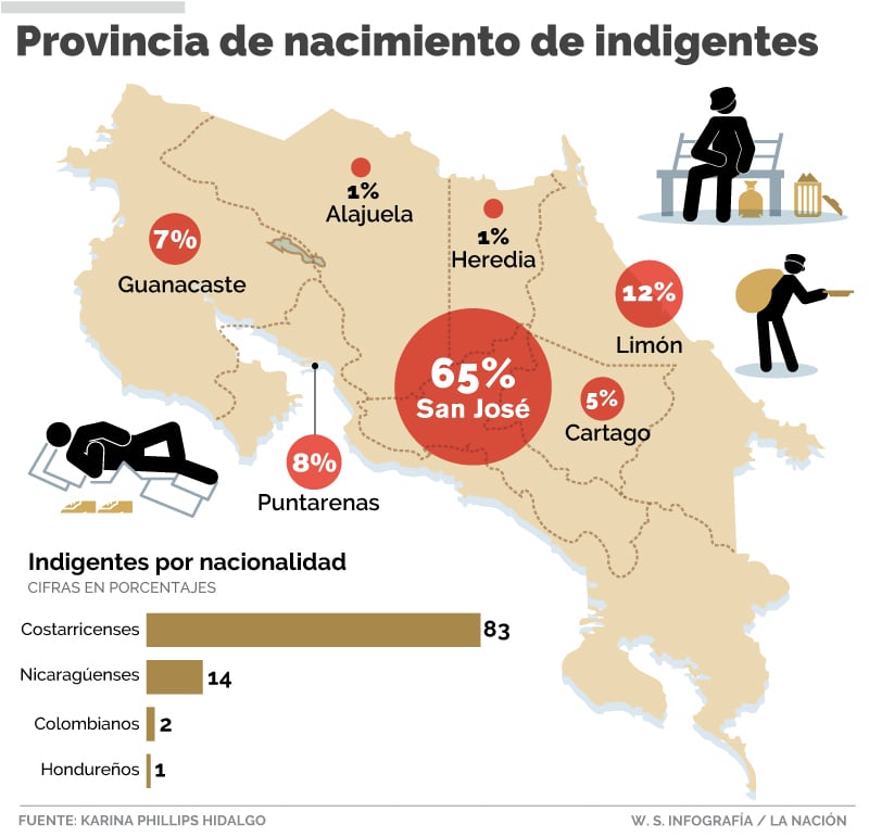 Phillips estima que el principal bloque de indigentes proviene de San José (65%), Limón (12%) y Puntarenas (8%). Cabe agregar, que por nacionalidad, la mayoría son costarricenses (83%), aunque también hay colombianos, nicaragüenses y hondureños.