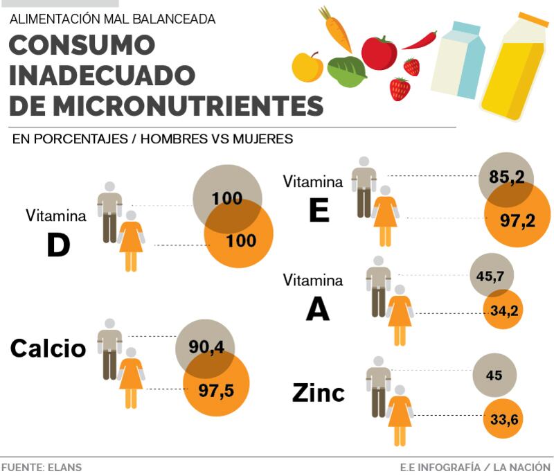 Por ejemplo el 100% de los hombres y de las mujeres estudiados no consumen la cantidad suficiente de vitamina D. Esta vitamina ayuda al cuerpo a absorber el calcio, uno de los principales componentes de los huesos. La vitamina D también juega un rol en su sistema nervioso, muscular e inmunitario. Este nutriente lo encontramos en el pescado, hígado y aceites.