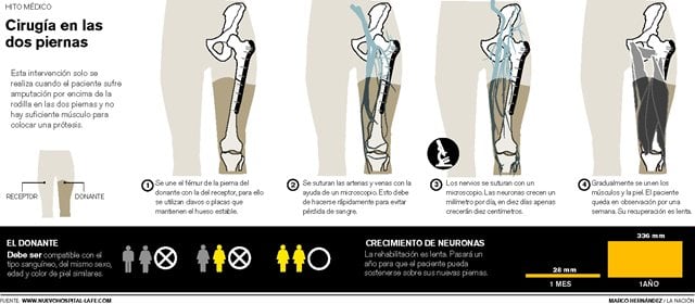 La cirugía se realiza por partes: primero, el hueso; luego, los vasos sanguíneos; después los nervios y, finalmente, los músculos y la piel.