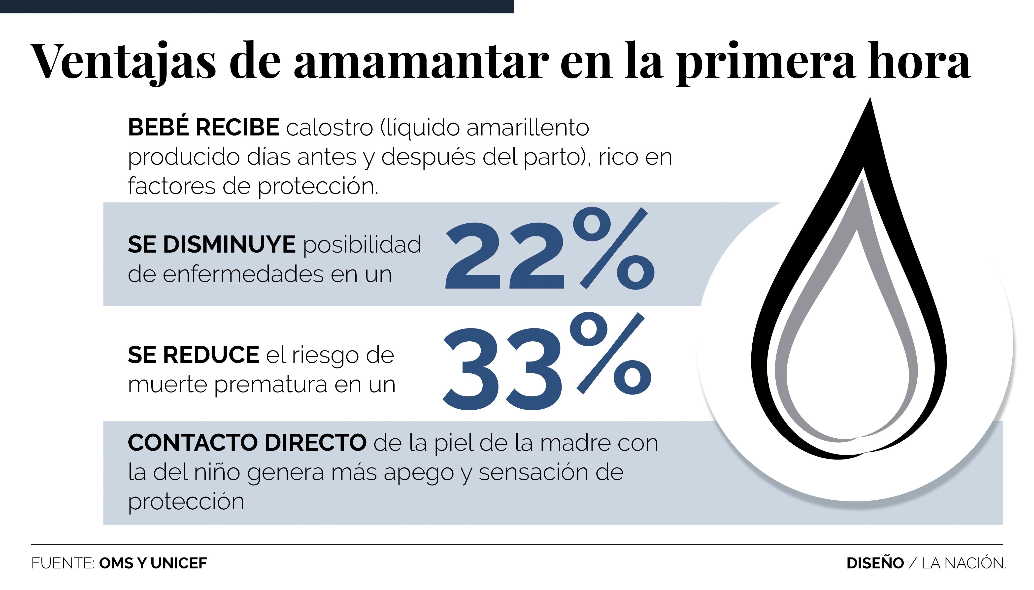 La costarricense Ingrid Broitman, nutricionista y asesora en lactancia materna explicó: “cuando un bebé se ‘prende’ del pecho, este arranca con calostro, no pierde tiempo de algo tan valioso. Esto le permite regular mejor su temperatura, los niveles de azúcar en sangre, el oxígeno en las células. Además, surge un mayor apego entre la mamá y el bebé y la lactancia fluye de manera más natural. Todo eso es importante”.
