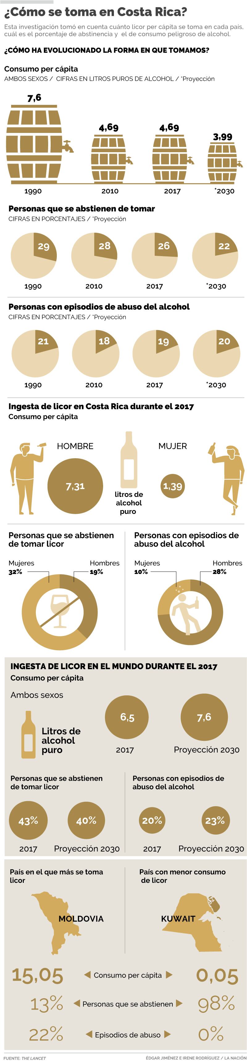 De acuerdo con el reporte, los costarricenses pasaron de tomar 7,6 litros de alcohol puro al año en 1990 a 4,69 en el 2017. Las proyecciones que realizan los autores del documento indican que la tendencia continuará a la baja para 2030, cuando se prevé que el consumo sea de 3,99 litros de alcohol puro al año.