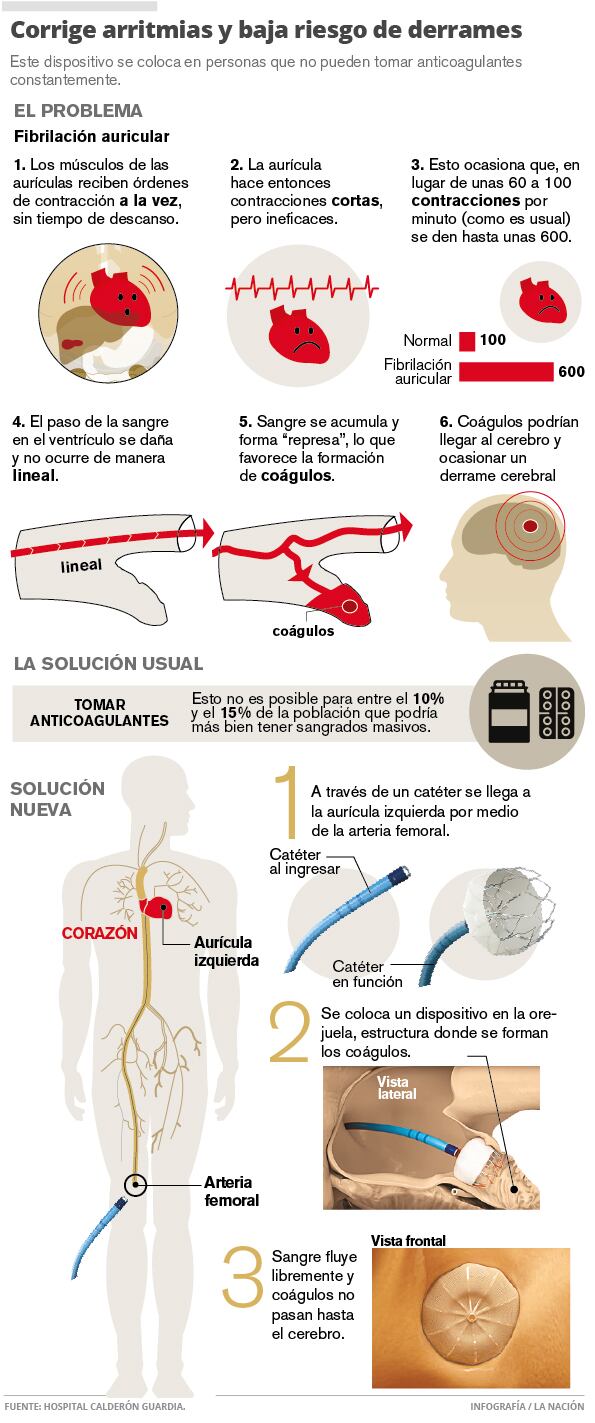 La técnica, puesta en práctica en el Hospital Calderón Guardia, se le conoce como oclusión de la orejuela auricular izquierda y, según los cardiólogos, es lo más novedoso para controlar estos casos.