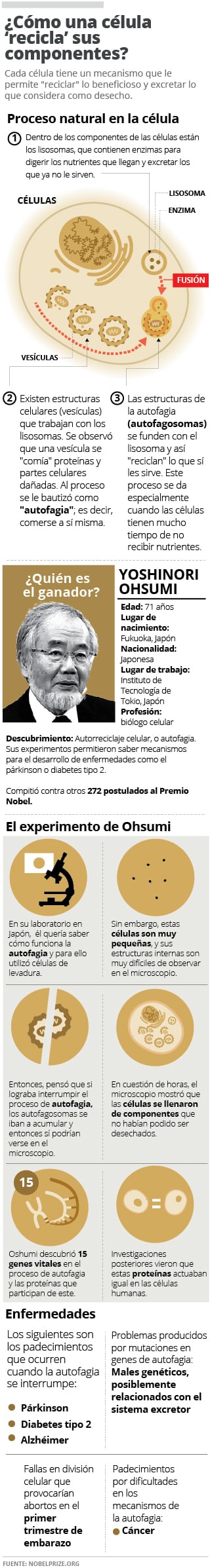 El japonés Yoshinori Ohsumi fue galardonado este lunes con el premio Nobel de Medicina por sus descubrimientos sobre la autofagia, a través de la cual las células digieren sus propios desechos y cuya disfunción puede provocar enfermedades como el Parkinson o la diabetes.