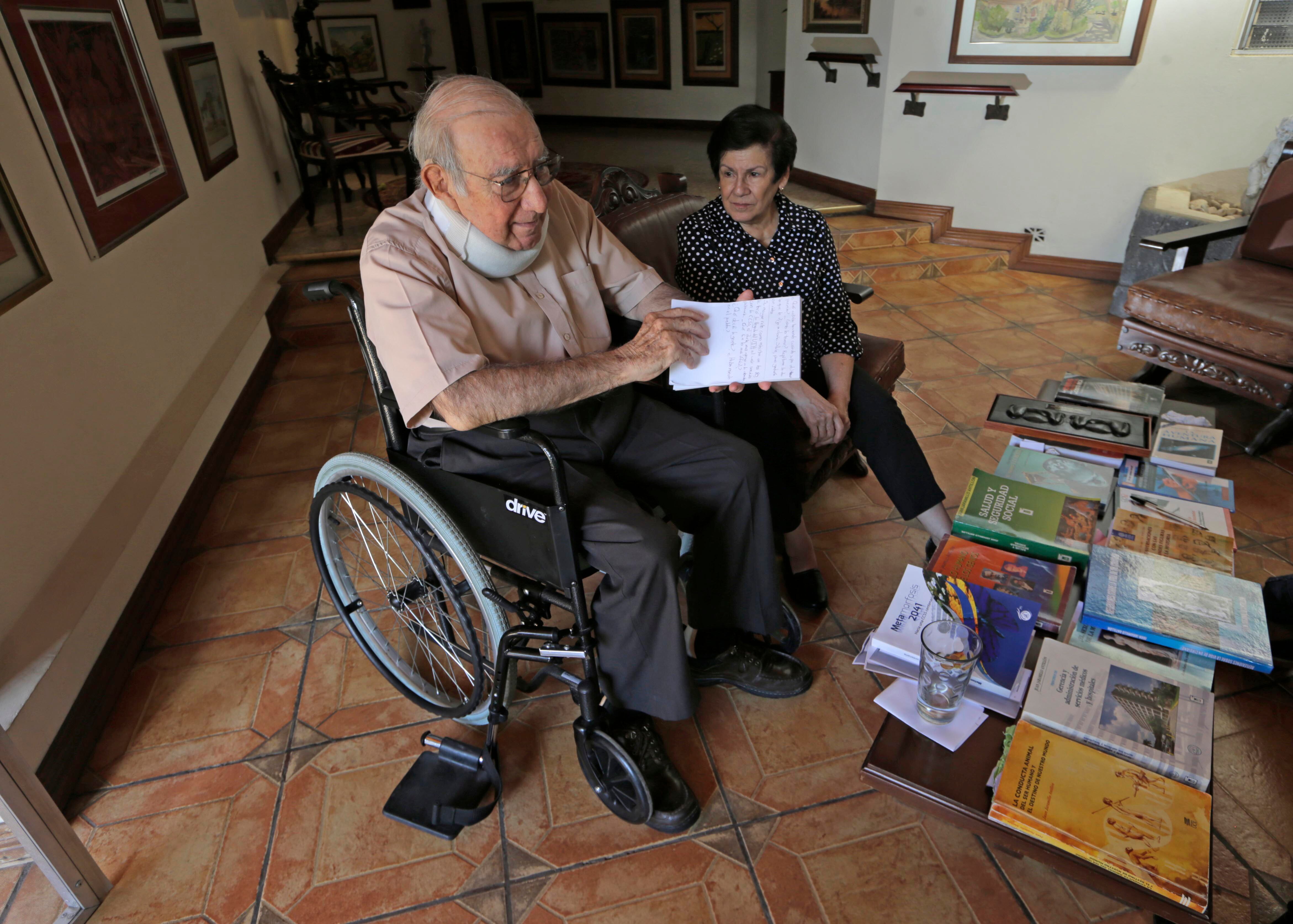 Con esa jovialidad recibió a La Nación, en medio de los 35 libros que escribió y la compañera de su vida, Mabel Borges, con quien está casado desde hace 60 años. Los acompañaba su "traductora oficial", "Chayito", quien escribía las preguntas que le hacían, pues una discapacidad auditiva le impide llevar una conversación sin que medie la escritura.
