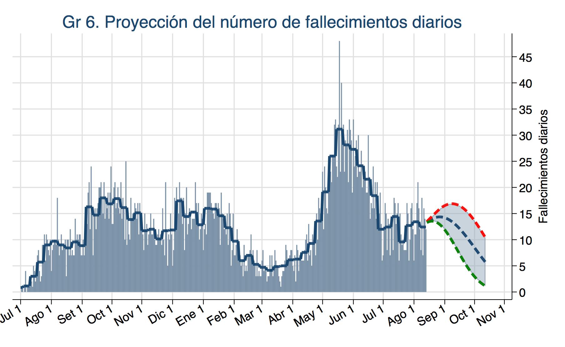 Los casos seguirían aumentando en las próximas dos o tres semanas hasta llegar a un pico de 2.200 casos diarios a principios de setiembre. Luego se baja y llega a 1.400 casos diarios el 13 de octubre.