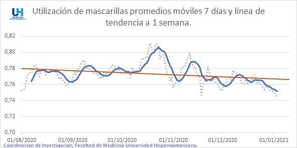 “Obtenemos de Facebook y de la Universidad de Maryland, la utilización de mascarillas desde el mes de agosto a la de diciembre. Observamos, con pesar, cómo a partir de noviembre ha venido disminuyendo el porcentaje de utilización de mascarillas, por la población costarricense, obteniéndose los más bajos valores en diciembre, durante la temporada navideña en que más gente salió a la calle, exponiéndose a un contagio mayor”, indicaron los investigadores.
