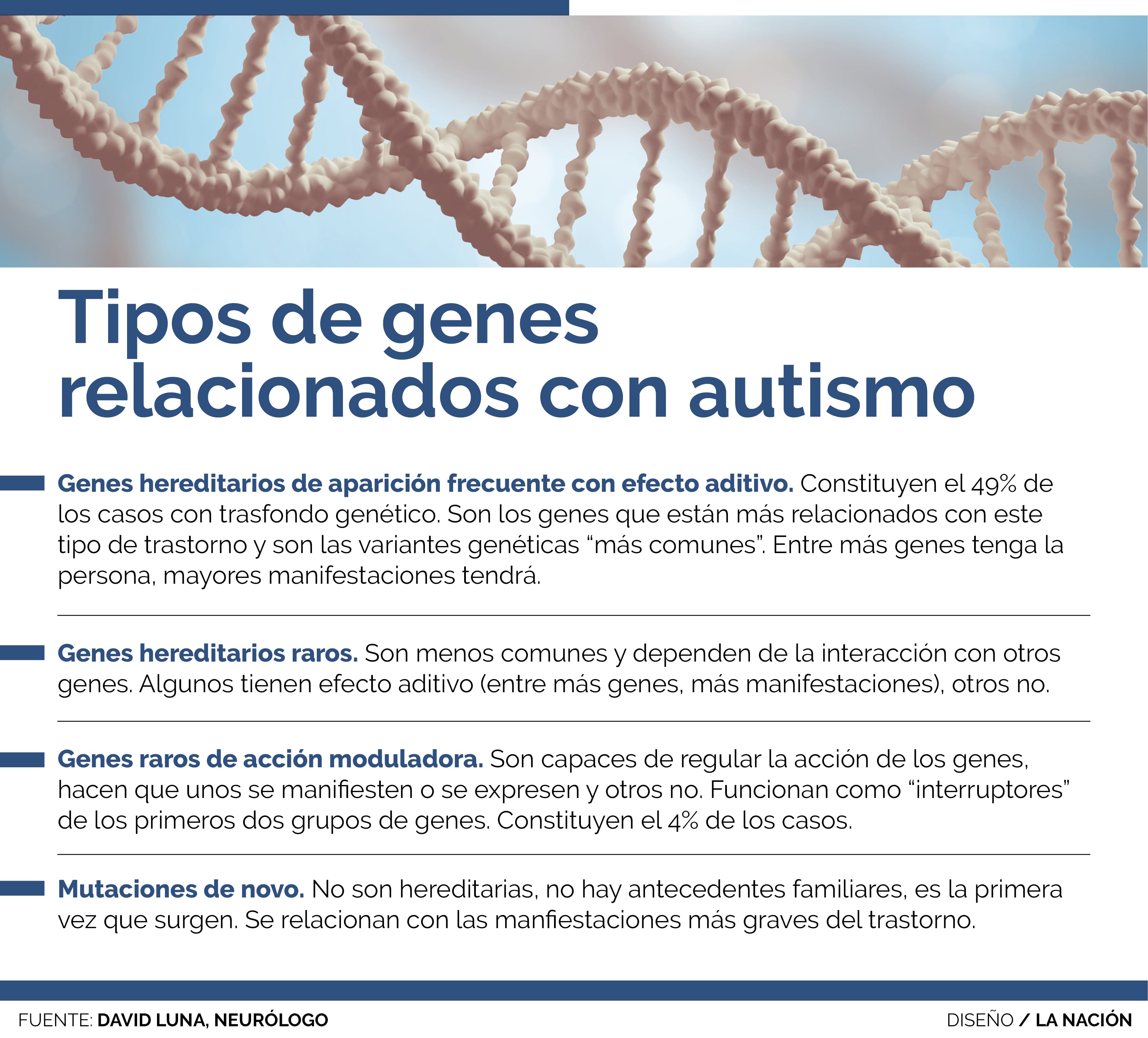 De acuerdo a Luna, hay cuatro tipos de genes que juegan un papel en el desarrollo y manifestación de estas condiciones neurológicas. Sin embargo, un 40% de casos aún no logran encajar definitivamente dentro de uno de estos grupos.